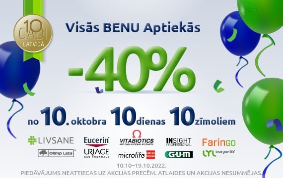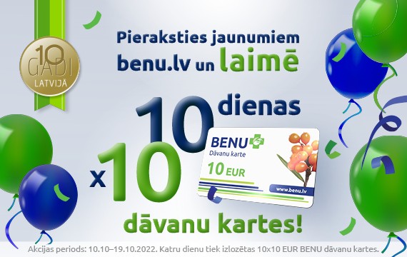 No šodienas, 10. oktobra, 10 dienas svinēsim BENU Aptiekas 10 gadu jubileju Latvijā! Sveicam ikvienu BENU Aptiekas klientu un darbinieku šajā zīmīgajā jubilejā un aicinām svinēt kopā! 10 gadu jubileju atzīmēsim ar lieliskiem piedāvājumiem visās BENU Aptiekās – no 10. oktobra 10 dienas 10 zīmolu produktiem 40% atlaide! Kā arī ik dienu BENU e-Aptiekā būs iespēja laimēt 10 dāvanu kartes 10 EUR vērtībā!