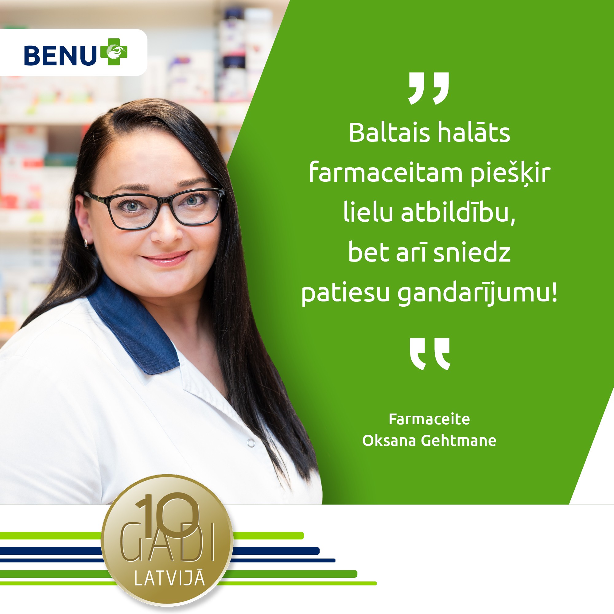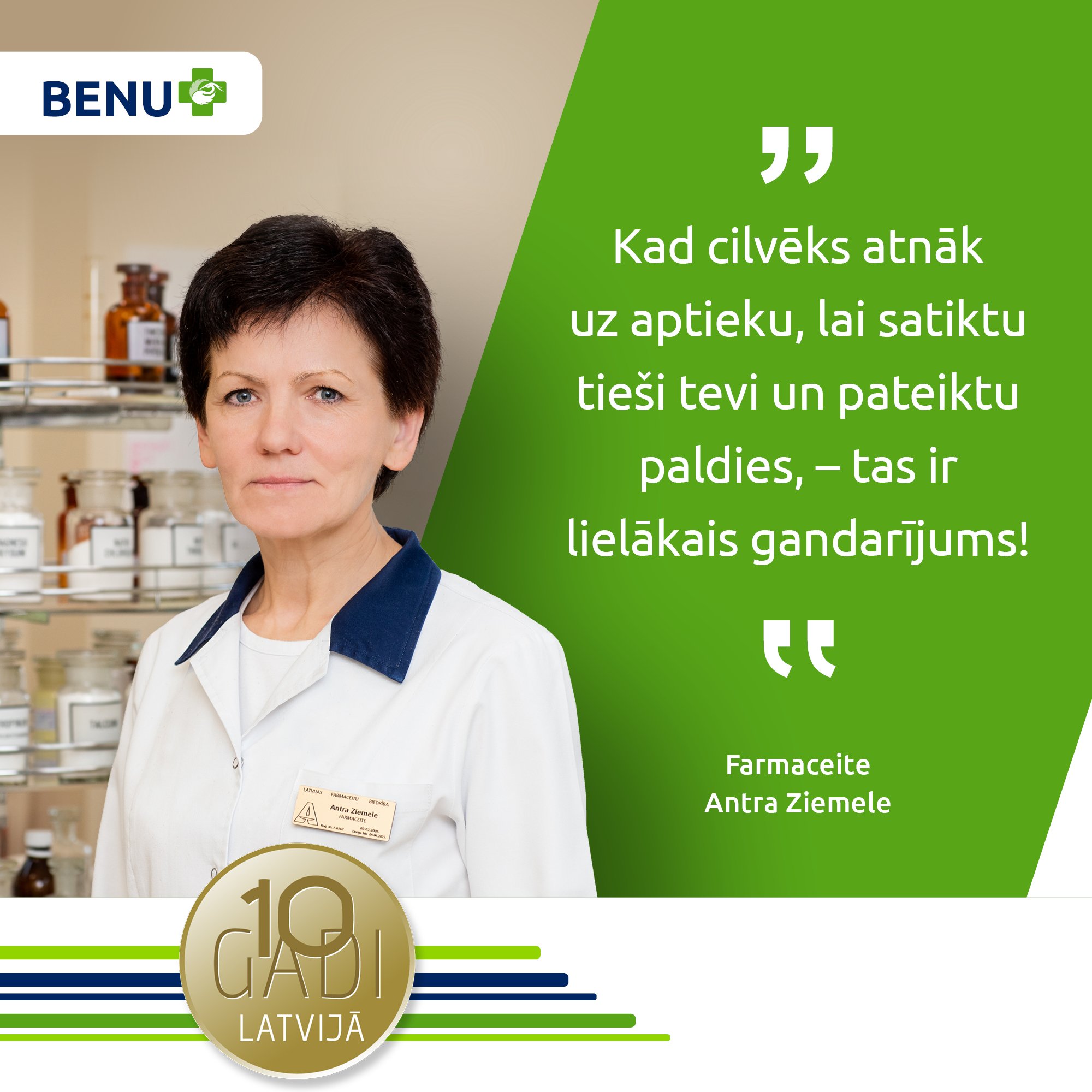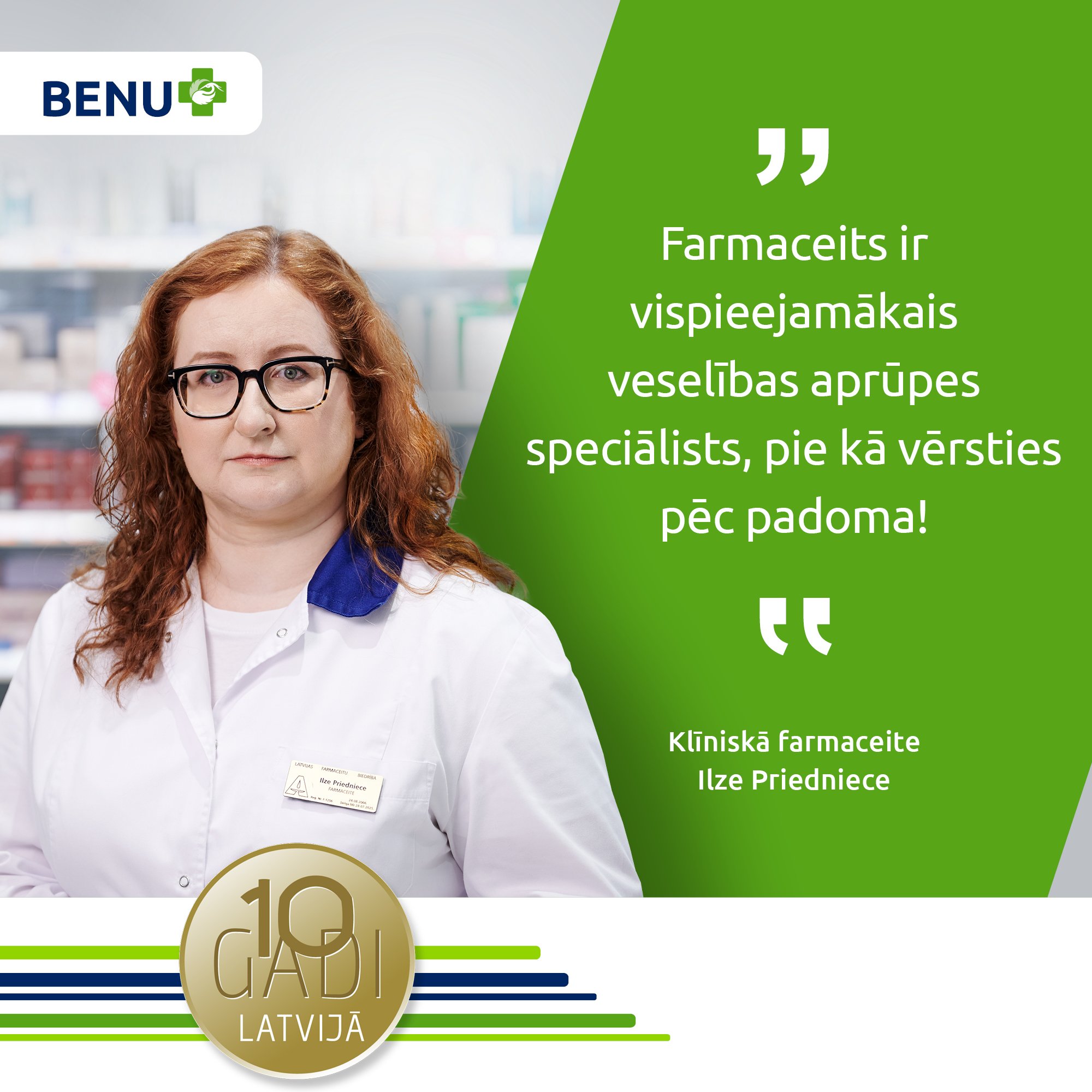 Atzīmējot BENU Aptiekas desmitgadi Latvijā, vēlamies pateikties ikvienam darbiniekam, kas bijis ar mums šajā laikā! Turklāt varam lepoties ar daudziem farmaceitiem un farmaceitu asistentiem, kas darbā BENU Aptiekā aizvadījuši visus šos desmit gadus! Aicinām iepazīties ar dažiem no viņiem, uzzinot viņu stāstus, pieredzi un sajūtas, strādājot aptiekā. Varbūt tas iedvesmos arī Tevi kļūt par farmaceitu vai daļu no BENU Aptiekas komandas!