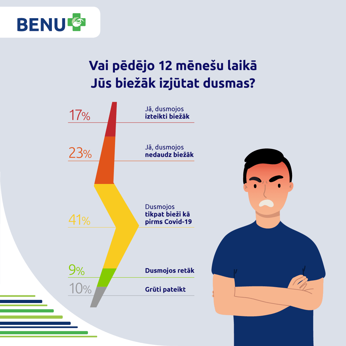 Kopumā 40% aptaujāto Latvijas iedzīvotāju atzīst, ka pēdējo 12 mēnešu laikā biežāk izjūt dusmas (17% – izteikti biežāk, 23% – nedaudz biežāk nekā parasti), 41% dusmu līmenis pandēmijas laikā nav mainījies, 9% dusmojas mazāk, bet 10% konkrētu atbildi sniegt nevarēja, secināts BENU Aptiekas Stresa termometros. Izteikti biežāk dusmas pandēmijas laikā izjūt jaunieši vecumā no 18 līdz 24 gadiem, kuru vidū 55% aptaujāto pēdējo 12 mēnešu laikā biežāk izjūt dusmas (29% – izteikti biežāk, 26% – nedaudz biežāk nekā parasti).