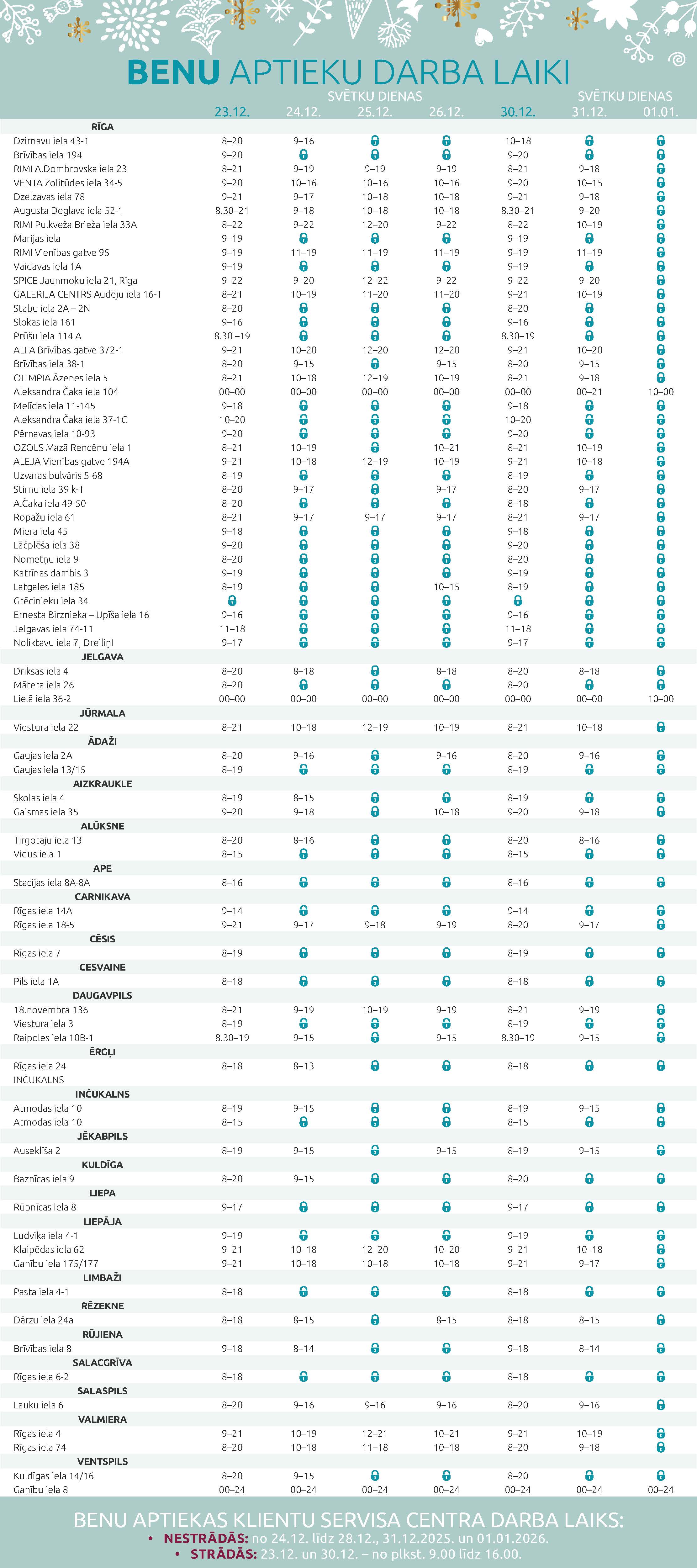 Novēlām Jums gaišus un mierpilnus svētkus! Atgādinām, ka svētkos mainās aptieku darba laiks. Ieskaties zemāk esošajā informācijā, lai noskaidrotu sev vēlamās aptiekas darba laikus.