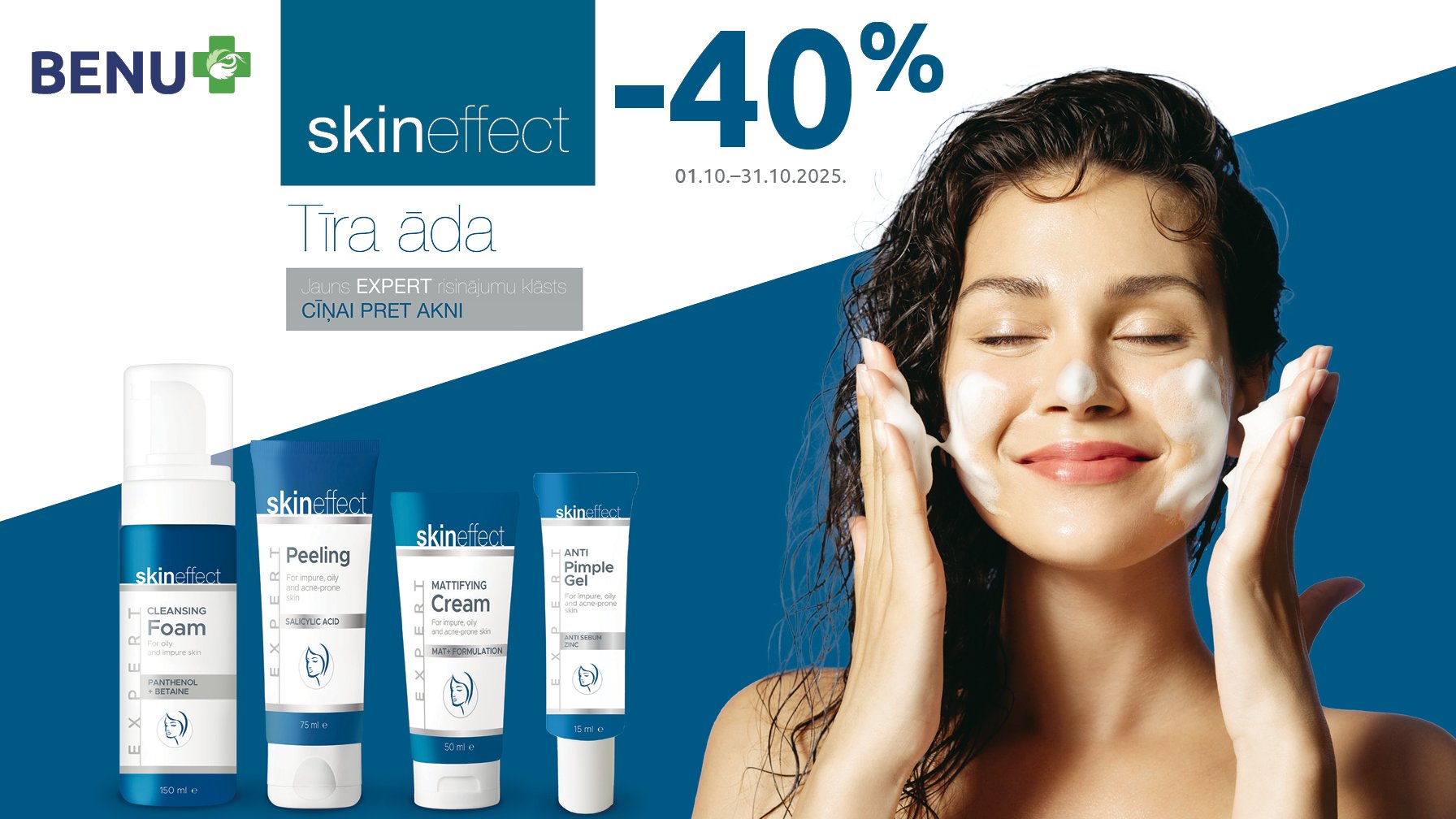 Visu oktobri BENU Aptiekās 40 % atlaide Skineffect pret-aknes līnijas kosmētikai, kas izstrādāta, lai palīdzētu efektīvi rūpēties par aknes skartu ādu. Produktu lietošana ir vienkārša – četru soļu rutīna tīrākai, gludākai un veselīgākai ādai.