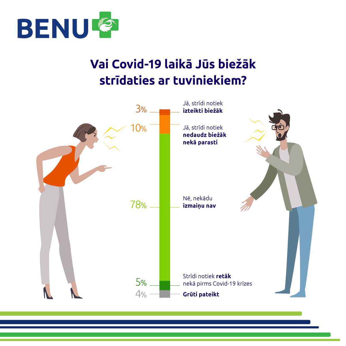 Jaunākie BENU Aptiekas Stresa termometra dati parāda, ka 13% Latvijas iedzīvotāju Covid-19 laikā biežāk sākuši strīdēties ar tuviniekiem (3% – izteikti biežāk, 10% – nedaudz biežāk nekā parasti). Salīdzinājumā ar šī gada aprīlī veikto aptauju rudenī strīdi ar tuviniekiem notiek biežāk, jo pavasarī tikai 6% atzīmējuši, ka attiecības ar tuviniekiem pasliktinājušās un strīdi kļuvuši par biežāku parādību. Tāpat dati parāda, ka 78% Covid-19 attiecības ar tuviniekiem nav mainījis, 5% pauduši viedokli, ka strīdu šobrīd ir mazāk nekā pirms Covid-19, savukārt 4% konkrētu atbildi sniegt nevarēja.