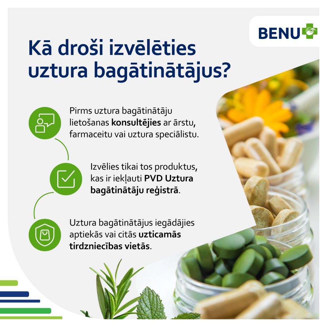 Izvēloties uztura bagātinātājus, svarīgi pievērst uzmanību to drošumam, sastāvam un iegādes vietai. No nezināmiem interneta pārdevējiem iegādāti produkti var būt bīstami veselībai. Savukārt, aptiekās pieejamie produkti ir reģistrēti PVD Uztura bagātinātāju reģistrā, atbilst kvalitātes prasībām un tiek uzglabāti atbilstošā temperatūrā. Konsultācijas ar farmaceitu palīdz izvērtēt produktu lietošanu un iespējamās mijiedarbības. Lai izvēlētos droši, BENU Aptiekas klīniskā farmaceite Ilze Priedniece skaidro galvenos kritērijus uztura bagātinātāju izvēlē.