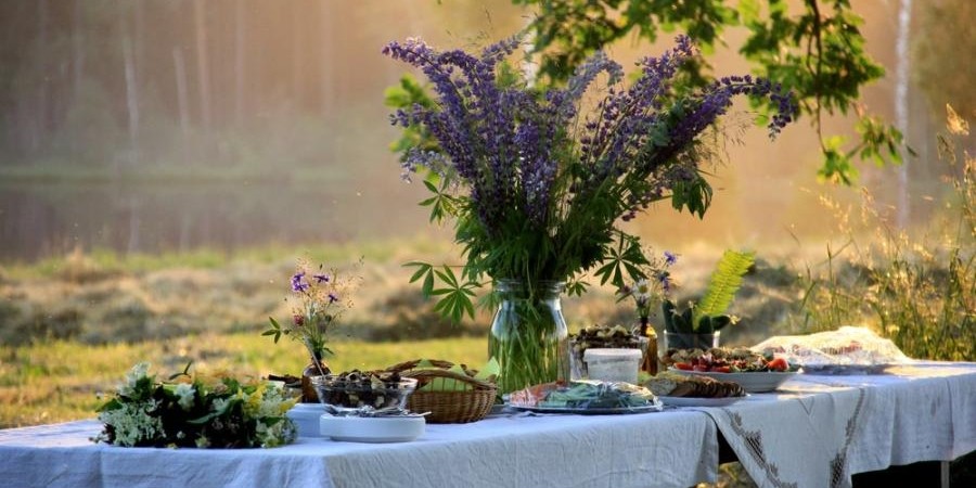 Plānojot svētku galdu, būtu ieteicams padomāt par pamatēdieniem. Īpaši svarīgi tas ir tad, ja viesi ierodas laicīgi. Dienas vidū tas varētu būt kāds pamatēdiens – uz ugunskura vārīta zupa, ceptas saknes, gaļa vai zivis. Sezonāli ēdieni būs aukstās zupas, zaļie salāti, dārzeņi un zemenes. Galdā var celt tikko iesālītus gurķīšus un zaļumus. Salātiem var izmantot citrusaugļu vai olīveļļas mērces, papildinātas ar sinepēm, mārrutkiem un zaļumiem. Viesiem garšos ar mizu vārīti kartupeļi ar biezpienu un zaļumiem. Noteikti celiet galdā dārzeņus – gabaliņos sagrieztus jaunos kāpostus, burkānus, gurķus un citus dārzeņus pēc izvēles. Nav nepieciešams tos jaukt ar rūpnieciski ražotajām mērcēm. Dārzeņi labi garšos tāpat, pārkaisīti ar citronpipariem, svaigiem zaļumiem. Svētku galdā tradicionāli būs siers – tas labi garšos gan viens pats, gan ar rudzu maizi, ar medu un ar zemenēm. Atcerieties celt galdā ogas un izcepiet kādu biezpiena sacepumu vai plātsmaizi ar rabarberiem. Svarīgi ir ievērot mērenību un nelikt uzreiz galdā visus viesu atvestos ēdienus, bet gan pakāpeniski papildināt svētku galdu, tādā veidā izvairoties no pārēšanās.