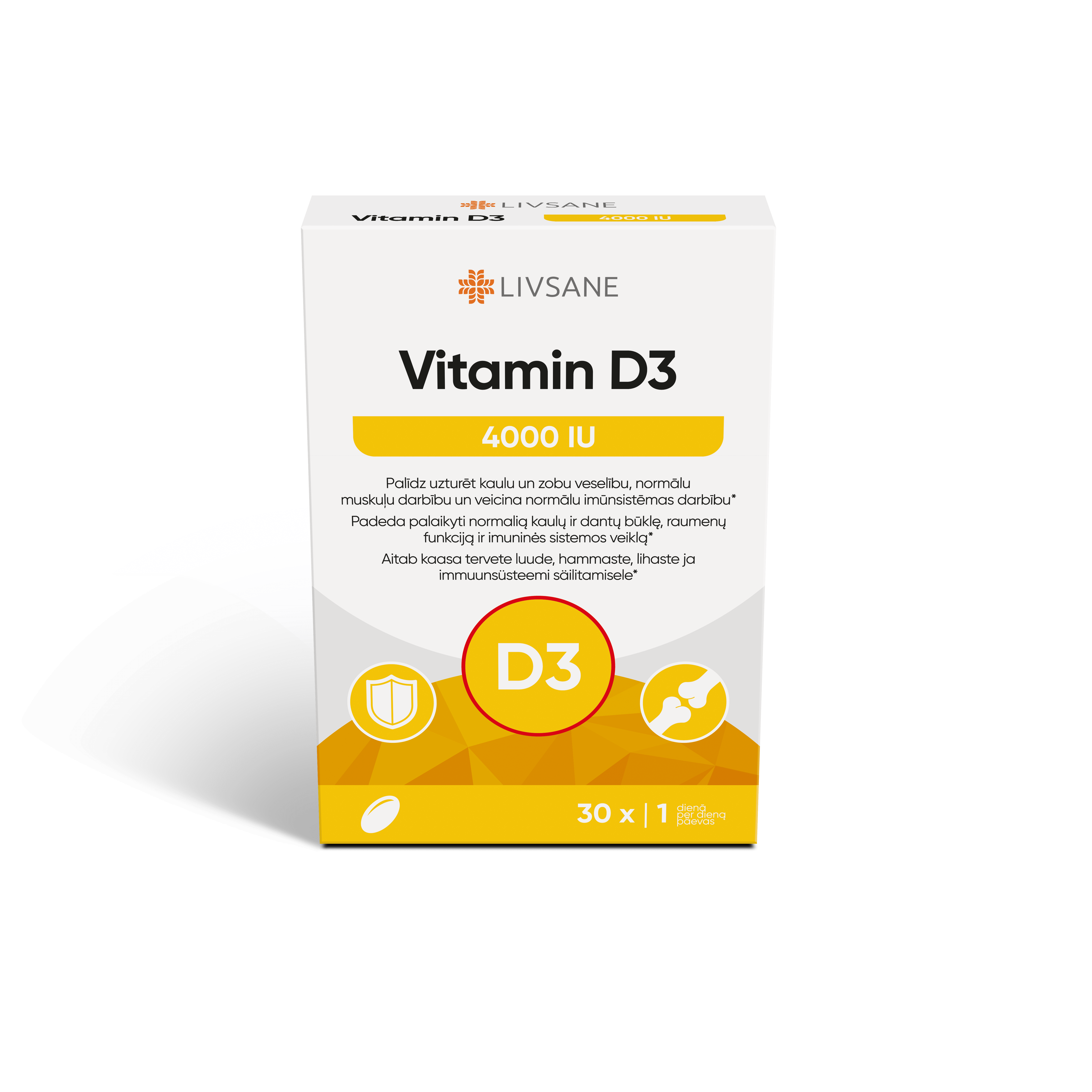 LIVSANE D3 4000 - AUGSTAS DEVAS D VITAMĪNS nodrošina organismu ar lielu D vitamīna devu. *D vitamīns palīdz uzturēt kaulu un zobu veselību, normālu muskuļu darbību un veicina normālu imūnsistēmas darbību.
