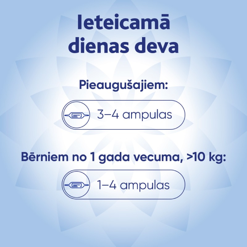 3-4 ampulas dienā, sadalot 2-3 devās, kas jāiedzer ēdienreizes laikā.