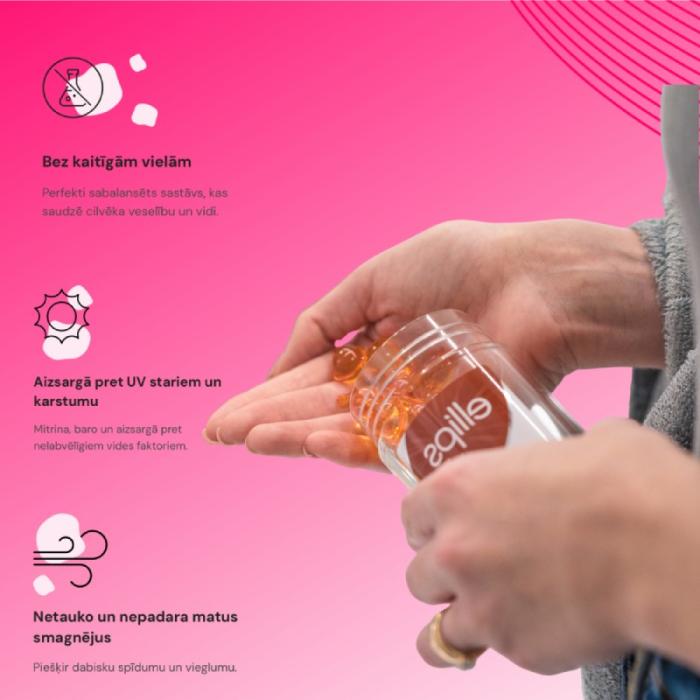 • Ellips "Hair Vitality" vitamīni ar argana sēklu eļļu, žeņšeņu, medu un A, C, E vitamīniem, B5 pro vitamīniem ir paredzēti raupjiem, trausliem, nepakļāvīgiem, kā arī sausiem un ārā krītošiem matiem.