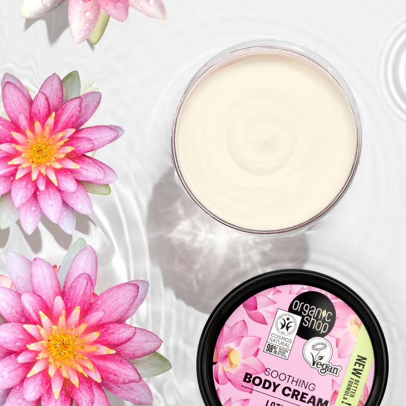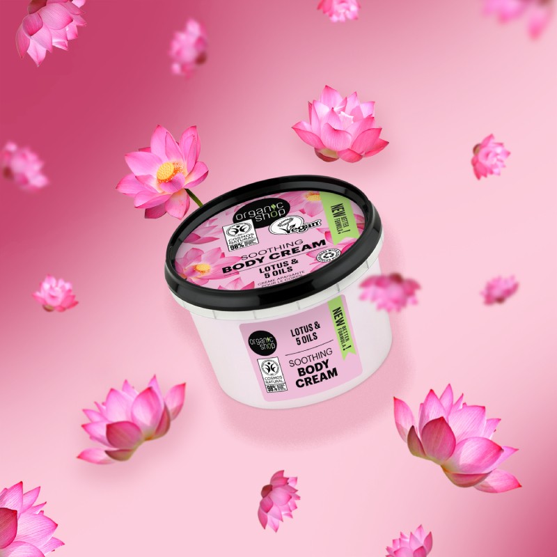 Nomierinošs ķermeņa krēms. Šis bagātīgais krēms ir izgatavots no ekoloģiskā lotosa ekstrakta un 5 eļļām – organiskie jojobas eļļas, naktssveces, borāžas, saldo mandeļu un šī koka sviests – atjauno un atsvaidzina ādu, padarot to gludu un mīkstu.