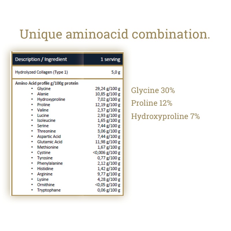 Katras dienas deva nodrošina 5 gramus 1. tipa kolagēna peptīdu, kas iegūti no hidrolizētas lasu ādas un satur lielu daudzumu tīru aminoskābju, tostarp līdz 30% glicīna. (Viena iepakojuma svars – 160 grami lasu kolagēna).