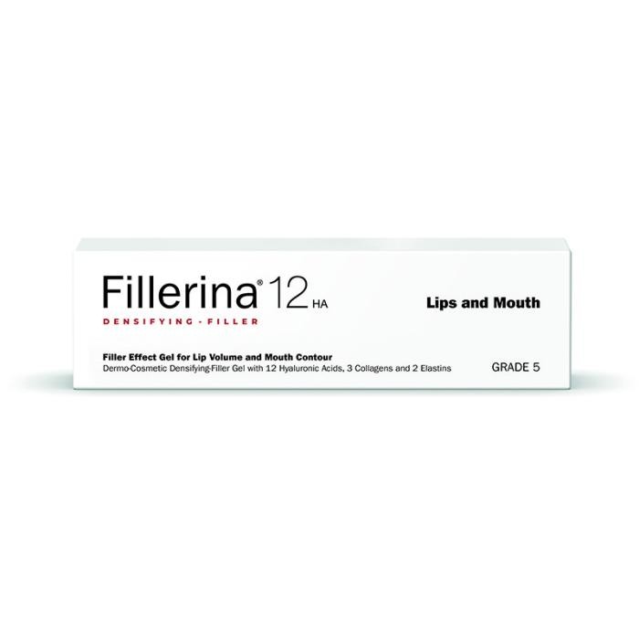 Fillerina 12HA dermo-kosmētiskās pildvielas gels lūpām un lūpu zonai piešķir piepildīšanas un liftinga efektu. Pateicoties pretgrumbu un audu aizpildīšanas iedarbībai, tiek izlīdzināta un izcelta lūpu kontūra. Preparāts satur modulētu koncentrāciju ar 12 hialuronskābes molekulām, ko papildina kolagēns ar 3 dažādām molekulām un elastīns ar 2 dažādām molekulām. Pateicoties tam, lūpu audi tie stiprināti un tām tiek piešķirts tvirtums. Intensitāte 5 novērš dziļas vecuma un mīmikas grumbas, izteiktas ādas tekstūras izmaiņas, acīmredzamu ādas noslīdējumu un tvirtuma zudumu.