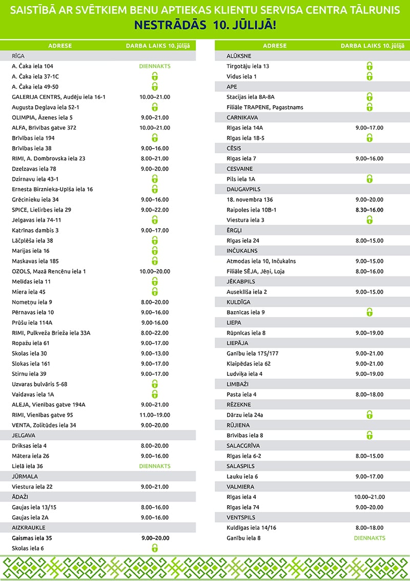 Novēlam jums priecīgu svētku laiku un atgādinām, ka 10. jūlijā mainās aptieku darba grafiks. Ieskatieties zemāk esošajā informācijā, lai noskaidrotu sev vēlamās aptiekas darba laiku.
