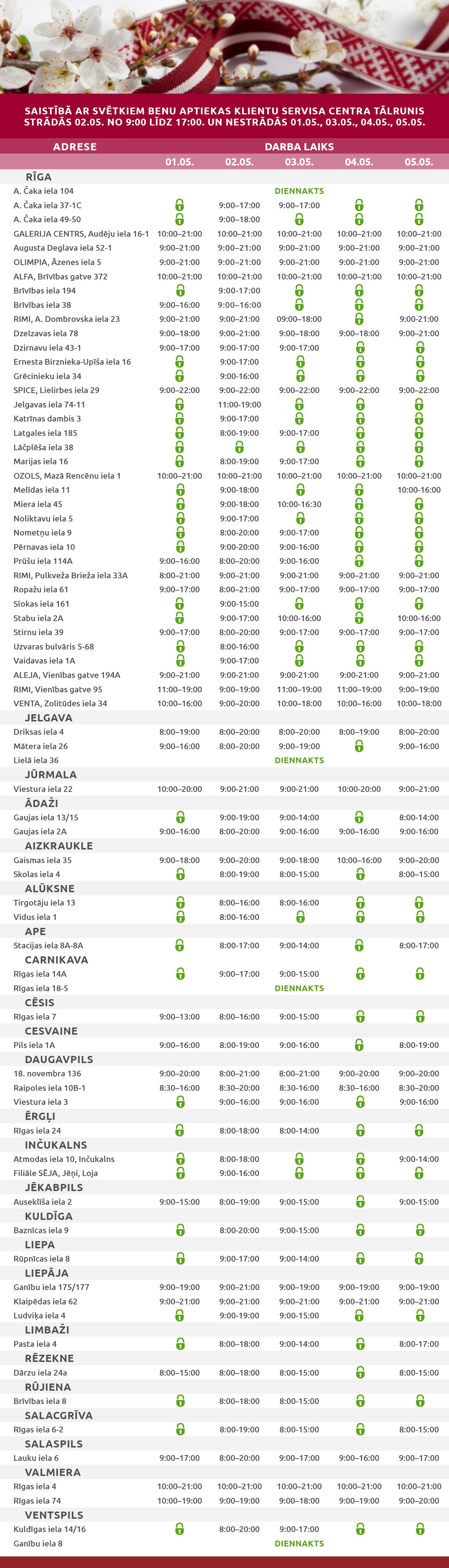 Novēlam jums priecīgu svētku laiku un atgādinām, ka svētkos mainās aptieku darba grafiks. Ieskatieties zemāk esošajā informācijā, lai noskaidrotu sev vēlamās aptiekas darba laiku svētkos.
