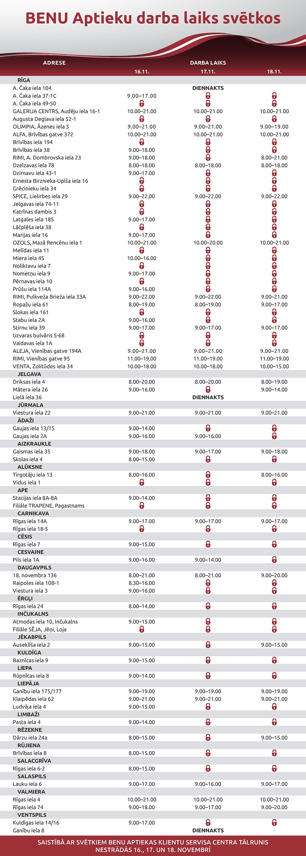 Novēlam jums priecīgu svētku laiku un atgādinām, ka svētkos mainās aptieku darba grafiks. Ieskatieties zemāk esošajā informācijā, lai noskaidrotu sev vēlamās aptiekas darba laiku valsts svētkos.
