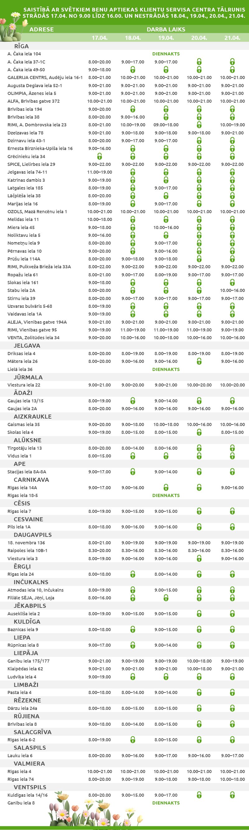 Novēlam jums priecīgu svētku laiku un atgādinām, ka svētkos mainās aptieku darba grafiks. Ieskatieties zemāk esošajā informācijā, lai noskaidrotu sev vēlamās aptiekas darba laiku svētkos.
