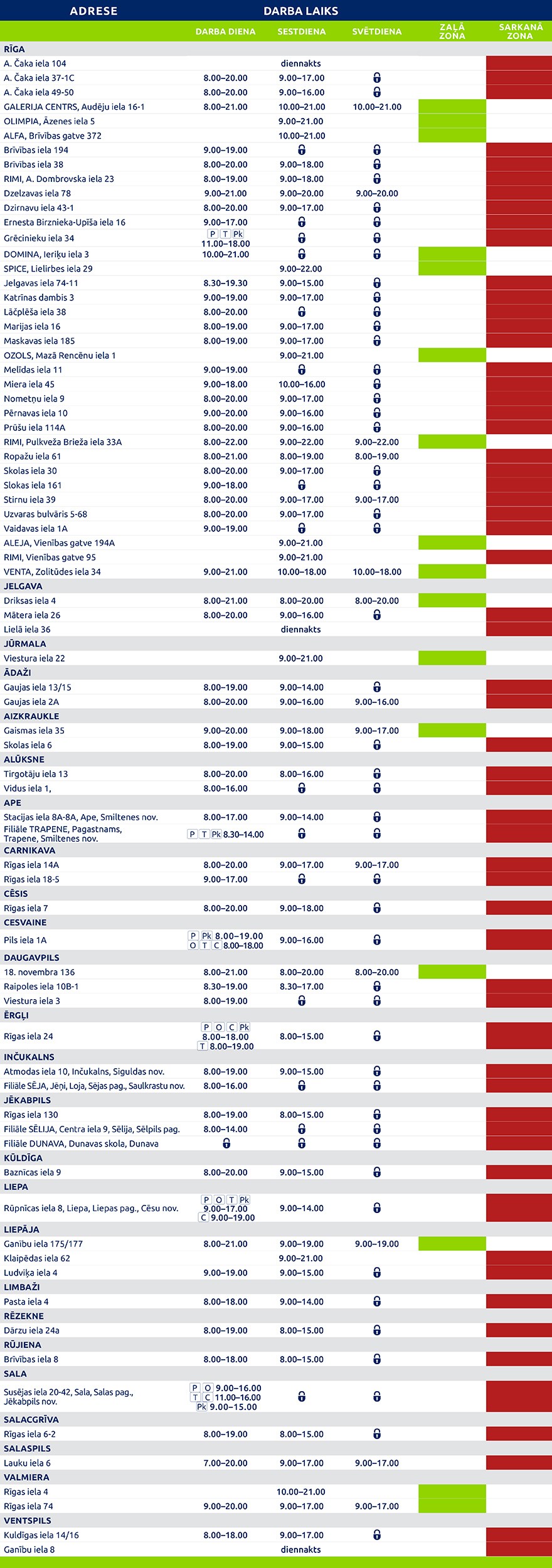 Saskaņā ar valdības lēmumu par tirdzniecības organizēšanu no 2021. gada 15. novembra BENU Aptieku darba režīms ir atkarīgs no konkrētās aptiekas atrašanās vietas. Zemāk esošajā tabulā atradīsi BENU Aptieku darba laikus no 15. novembra* un informāciju par to, kādā režīmā tās darbosies.