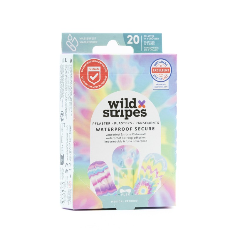 Wild Stripes Waterproof Secure Rainbow plāksteri ir ES atbilstoši medicīnas līdzekļi, kas nodrošina 100 % ūdensizturīgu aizsardzību un izcilu noturību pat mitros apstākļos. Tie ir hipoalerģiski, saudzīgi ādai un nodrošina drošu aizsardzību pret netīrumiem un baktērijām.