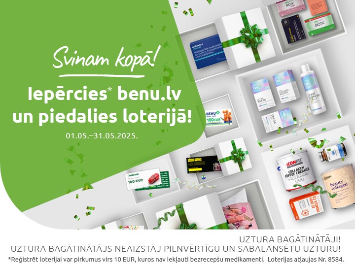 No 1. līdz 31. maijam iepērcieties BENU e-Aptiekā 10 EUR vērtībā*, reģistrējiet čeku un laimējiet kādu no nedēļas vai mēneša balvām.