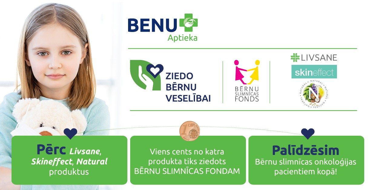 Ikvienam BENU Aptiekas klientam ir iespēja piedalīties labdarības kampaņā, iegādājoties Livsane, Skineffect un Natural zīmolu produktus. Pērkot tos, 1 cents no katra produkta tiks ziedots Bērnu slimnīcas fondam.