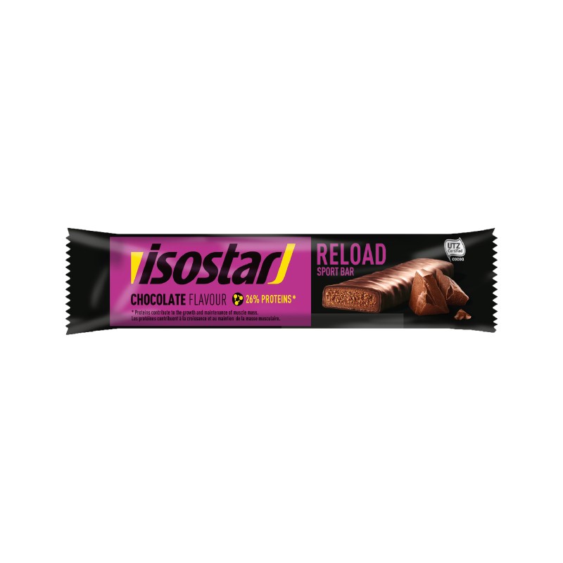 Isostar Reload Sport Bar Chocolate batoniņš ar šokolādes garšu ir speciāli izstrādāts, lai optimizētu atjaunošanās procesu sportistiem, it īpaši pēc izturības sporta veidiem. Tā sastāvā esošās olbaltumvielas palīdz saglabāt un atjaunot muskuļu apjomu. Ogļhidrāti palīdz atjaunot iztērētās glikogēna rezerves. Atjaunojošā proteīna batoniņā esošie vitamīni un minerālvielas kompensē tos zudumus, kuri radušies svīšanas laikā, aktīvi sportojot. Vitamīns B1, vitamīns B2, vitamīns B6 un vitamīns PP  ir nepieciešami, lai organisms pārvērstu barības vielas enerģijā, vitamīns B2 un vitamīns B6  ir iesaistīti sarkano asinsķermenīšu veidošanā. Tie ir atbildīgi par skābekļa piegādi muskuļiem. Vitamīns B6 ir nepieciešams olbaltumvielu un glikogēna metabolismā. Vitamīns C un vitamīns E ir antioksidanti, kas aizsargā organisma šūnas no brīvo radikāļu iedarbības.Isostar Reload Sport Bar Chocolate batoniņš piemērots lietošanai pēc fiziskas slodzes. Ieteicams lietot pirmajās 15-30 minūtēs pēc slodzes. Var lietot kopā ar After Sport Reload dzērienu. Lietot kā papildinājumu veselīgam dzīvesveidam un sabalansētam uzturam.