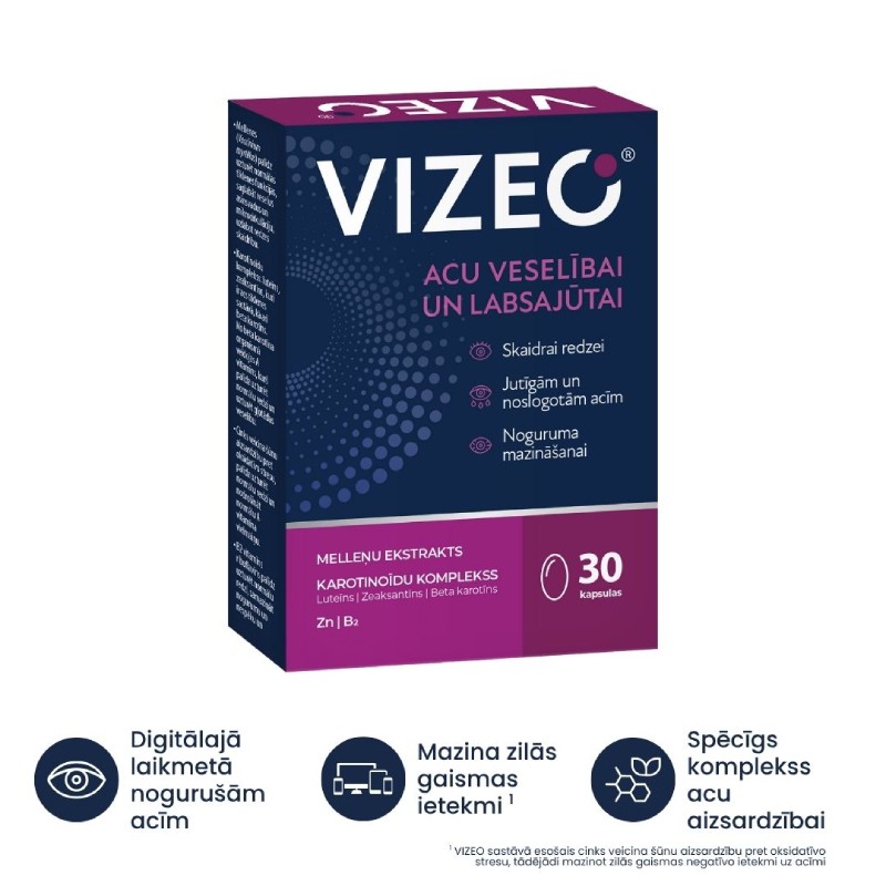 Redze un acu veselība ir būtiskas ikvienam cilvēkam. VIZEO® kapsulu sastāvs ar melleņu ekstraktu, karotinoīdu kompleksu, cinku un B2 vitamīnu ir īpaši radīts, lai rūpētos par acu veselību un labsajūtu. Mūsdienu pasaulē mūsu acis ik dienu ir pakļautas intensīvai slodzei: viedtālruņi ir ieņēmuši paliekošu vietu gan saziņā, gan kā informācijas avots. Arī TV un datora ekrānu starojums, īpaši spektra zilā gaisma, nogurdina mūsu acis un var radīt jūtamu diskomfortu. Tāpat transportlīdzekļu vadīšana vai viedtālruņu lietošana sabiedriskajā transportā rada papildus slodzi mūsu acīm.